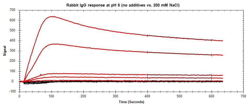 Figure 2: Reduction in NSB of a charged analyte (rabbit IgG) with the addition of 200 mM NaCl. Red curves represent non-specific binding from various analyte concentrations. Black curves represent the corresponding response of analyte with the addition of salt to the running buffer.