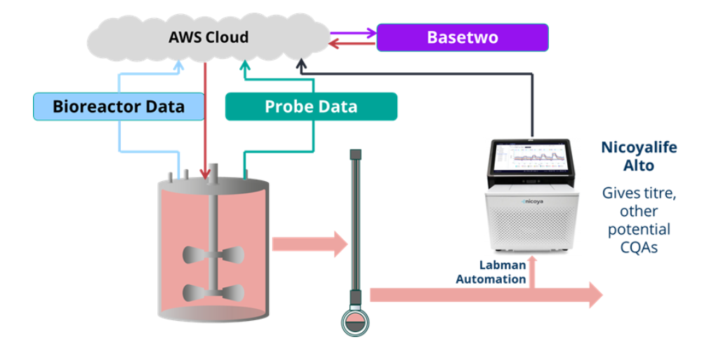 Schematic of the integrated system under development in the BALANCE project. Basetwo’s AI platform will integrate real-time data from both the bioreactor and Nicoya’s Alto Digital SPR to dynamically optimize bioprocess conditions. Labman will design the automation technology that connects all components into a unified system, while CPI will contribute its bioprocessing expertise and bioreactor infrastructure to validate the platform in realistic manufacturing scenarios.