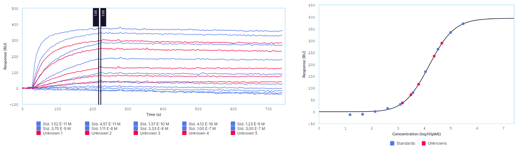 Images taken from Alto’s Nicosystem analysis software showing data from an experiment quantifying antibodies in serum. Antigen was used as the ligand. Binding curves for antibody standards (blue) and unknown samples (red) are shown on the right. The Nicosystem automatically generates a standard curve (left) based on the response of the standards at the user defined report points that is used to determine the concentration of the samples where the antibody concentration is unknown.