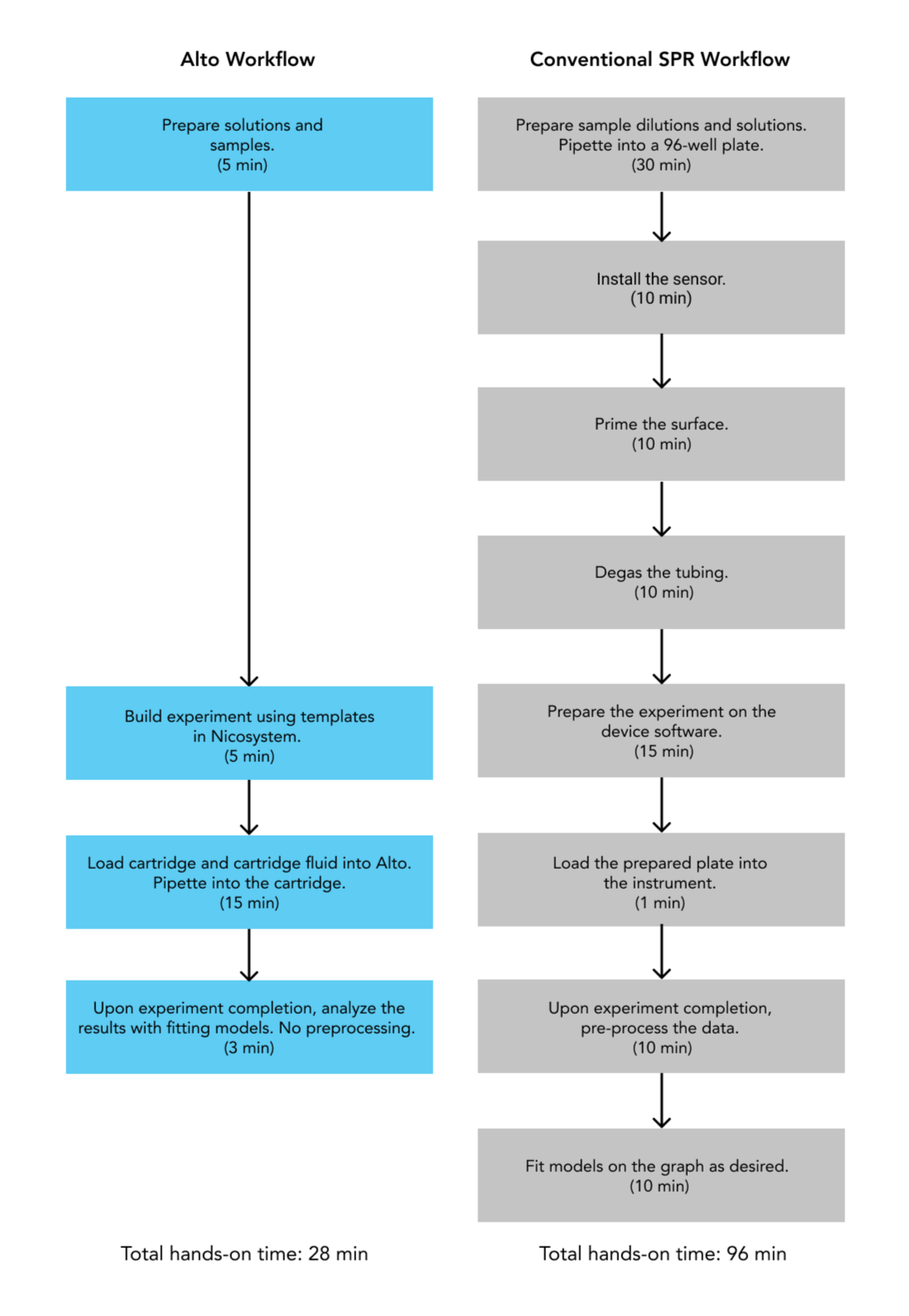 Traditional end-point assays only provide limited affinity and concentration data, and can only assess one interaction characteristic per assay. Instead, SPR is able to generate comprehensive data on multiple interaction characteristics in parallel, including affinity, kinetics, concentration, and specificity, allowing the user to eliminate low quality candidates in one fell swoop and minimize the hands-on time required for experimentation.