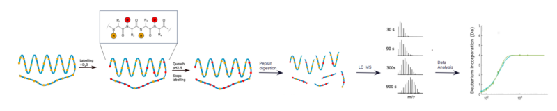 Hydrogen-Deuterium Exchange Mass Spectroscopy (HDX-MS) is a powerful technique for researchers to study protein interactions and conformational changes. The technique involves exposing proteins to heavy water (D2O), allowing deuterium to replace the hydrogen atoms in the protein backbone, with exposure times varying from a few seconds to hours. The rate at which this exchange happens in various regions of the protein is indicative of their level of exposure to the deuterium and provides useful information about the protein’s structure and dynamics.