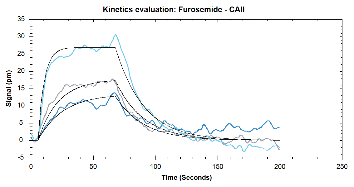 Figure 4. Binding of Furosemide at concentrations of 333nM, 1μM, and 9μM. Solid black lines are the one to one binding model fits.