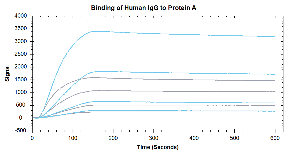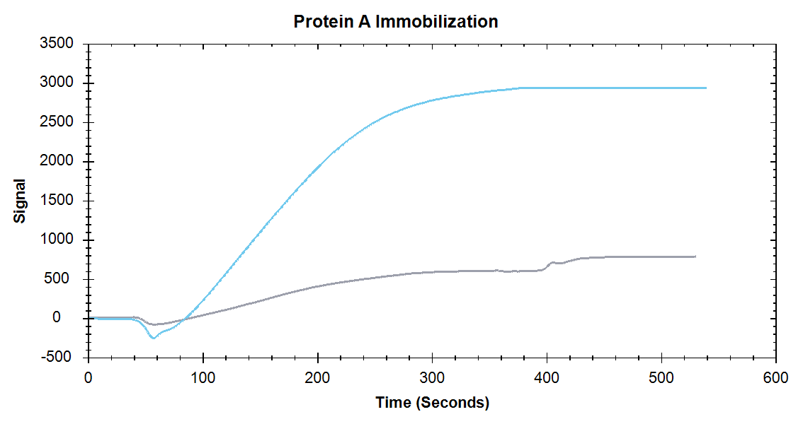 Figure 1. Immobilization of Protein A onto a High Sensitivity Carboxyl Sensor (blue) and Standard Carboxyl Sensor (grey).