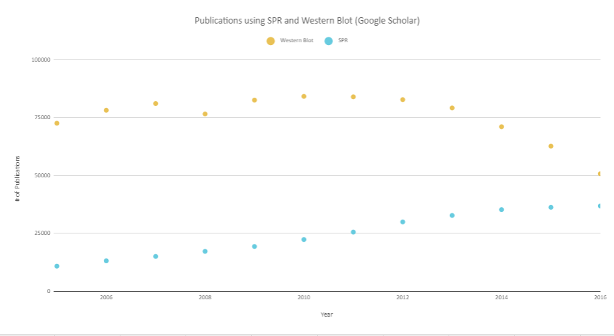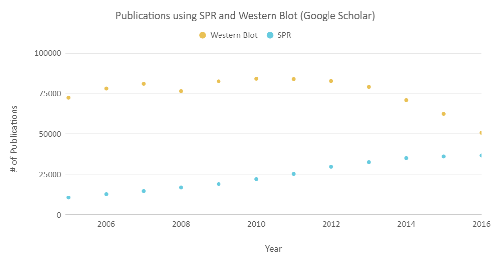 Surface Plasmon Resonance is a label-free technology which allows researchers to analyze binding between two biomolecules quantitatively. SPR technology will enable us to determine the kon, koff and KD of interactions, providing more in-depth insight into binding events compared to other techniques that only give endpoint measurements, such as pull-down assays. SPR is necessary not only for publications but for the advancement of many fields of medicine and medical research as can be seen below with the significant increase in papers that rely on SPR data.