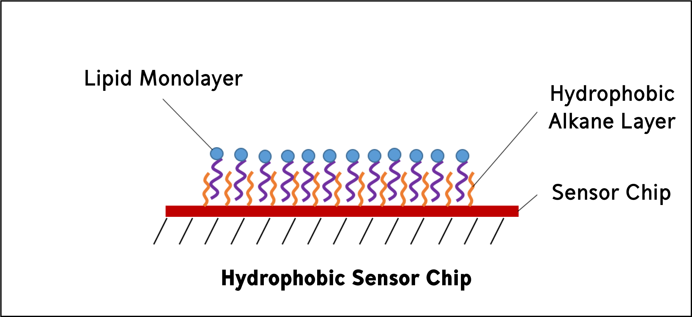 Hydrophobic sensor chips are used to immobilize lipid molecules into a monolayer on the sensor surface. Hydrophobic sensor chips are coated with a hydrophobic layer of long-chain alkane molecules, which means that partially solubilized lipids will self-assemble to the surface creating a monolayer with the hydrophilic groups positioned away from the surface.