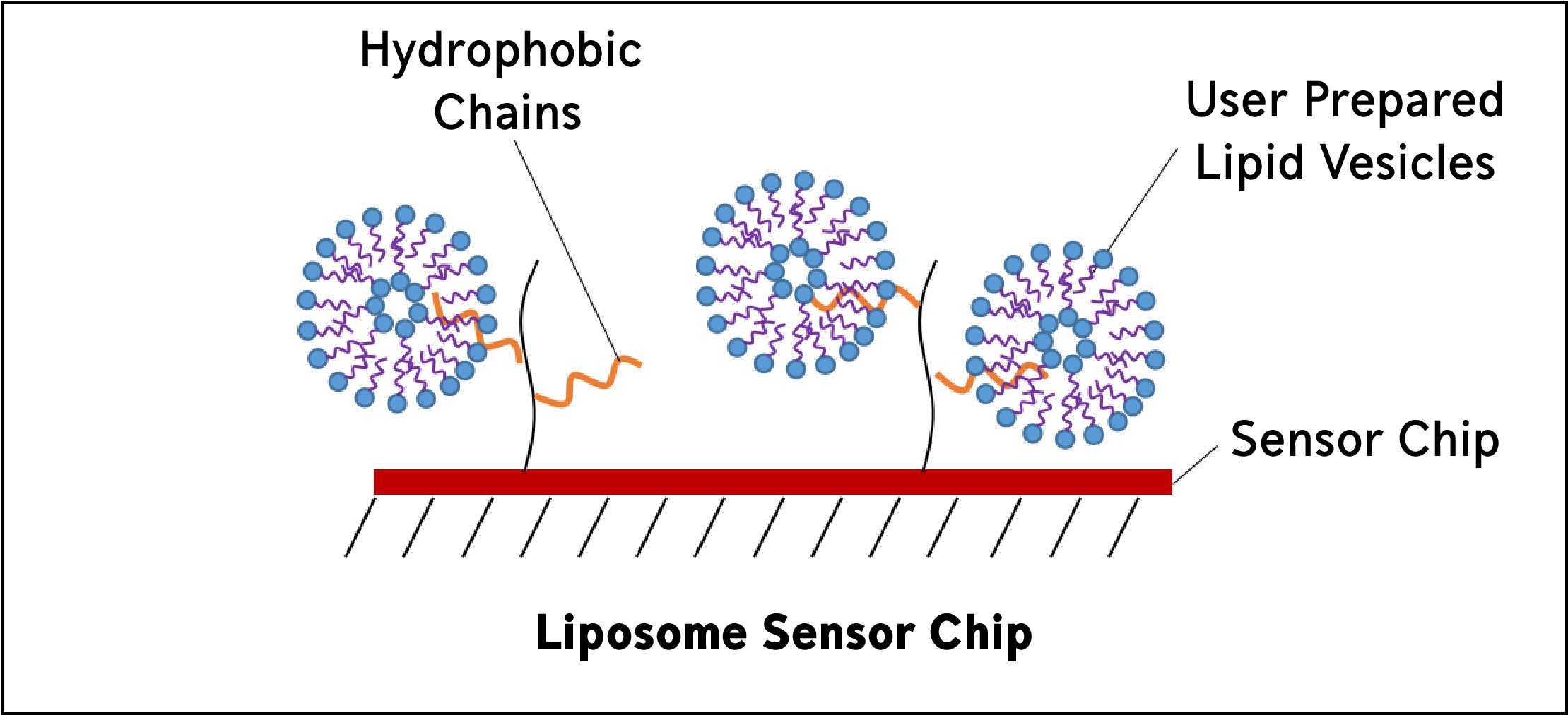 Liposome sensor chips are used to capture user-prepared liposomes. They are composed of covalently attached lipophilic groups. Lipid vesicles, or liposomes, mimic biological membranes and can be a convenient way to study membrane systems.