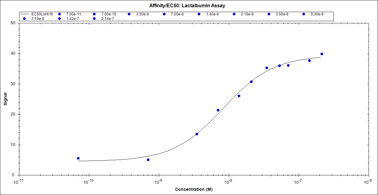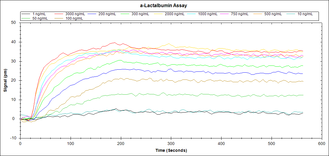 Binding of α-lactalbumin to anti- α-lactalbumin at concentrations of 3000, 2000, 1000, 750, 500, 300, 200, 100, 50, 10, and 1 ng/ml.