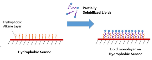 Hydrophobic sensors are coated with a hydrophobic layer of long-chain alkane molecules which allow for the immobilization of lipid molecules for interaction analysis. Partially solubilized lipids will self-assemble into a monolayer with hydrophilic groups positioned away from the surface. If you are looking at lipid-related interactions, our hydrophobic sensors may provide the ideal conditions for your ligands.