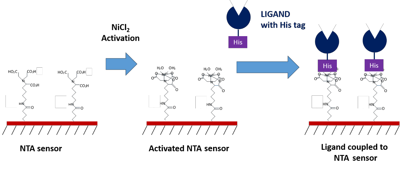 Another commonly used compound for capture coupling is nitrilotriacetic acid (NTA), which can capture his-tagged ligands. This technique provides a convenient method of immobilization for those who use poly-histidine (His-6) tags for purification purposes. An advantage to NTA sensors is that the surface can often be reused, as the his-tagged ligand can be easily removed using chelating agents like EDTA. However, depending on your application, the lower bond strength of the coupled ligand can sometimes be a disadvantage as it may cause the ligand to slowly dissociate from the sensor surface over time, or result in unwanted ligand removal during regeneration. If your ligand is his-tagged, NTA sensors are a convenient and versatile option to explore.