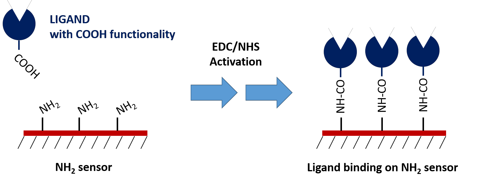 Carboxyl sensors require EDC/NHS chemistry to activate the functional groups on the sensor surface, which can then bind to the ligand’s available amine groups or lysine residues. To help with this, we’ve put together a well-crafted activation kit which contains all reagents necessary to perform this coupling and has been optimized for best performance.