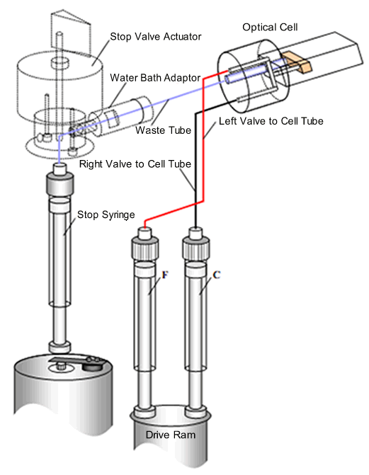 The stopping mechanism is a stop-syringe. Reagents are contained in two drive syringes (C and F). A drive ram pushes the syringe pistons such that the reagents are pushed through flow tubing to a mixer and then to the observation cell. This process pushes the ‘old’ cell contents towards the stop-syringe. The flow fills the stop-syringe, until the piston hits the trigger switch. This action simultaneously stops the flow and starts data acquisition. At this instant, the age of the reaction of the newly-mixed reagents in the observation cell is about one millisecond. The exact age (called the dead time) depends on the design of the stopped-flow instrument and the observation cell.