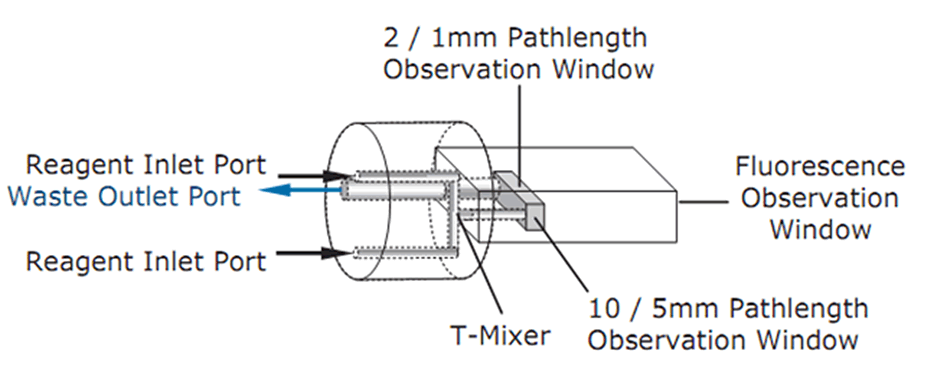 In an SX20 stopped-flow spectrometer, two optical pathlengths are available for absorbance detection (2 mm and 10 mm, or 1 mm and 5 mm, depending on cell type). The mixer is an integral part of the observation cell and has a dedicated observation window for fluorescence detection.