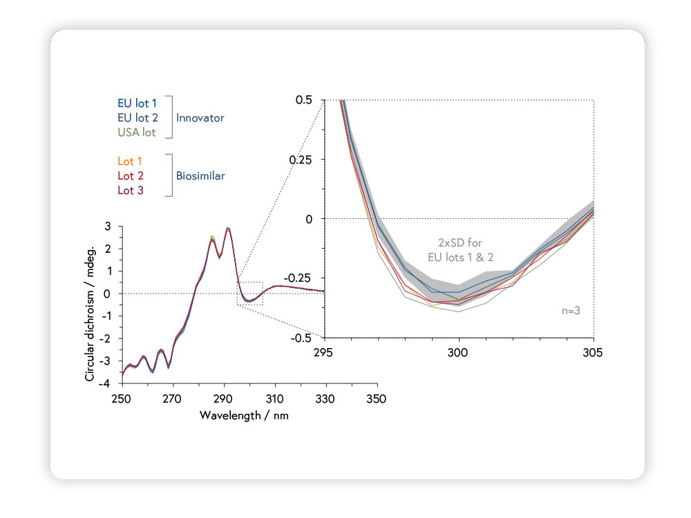 Determine innovator HOS characteristics. CD analysis of tertiary structure in a highly absorbing chiral formulation buffer suggested differences in tryptophan region of Fab fragments from different innovator lots.