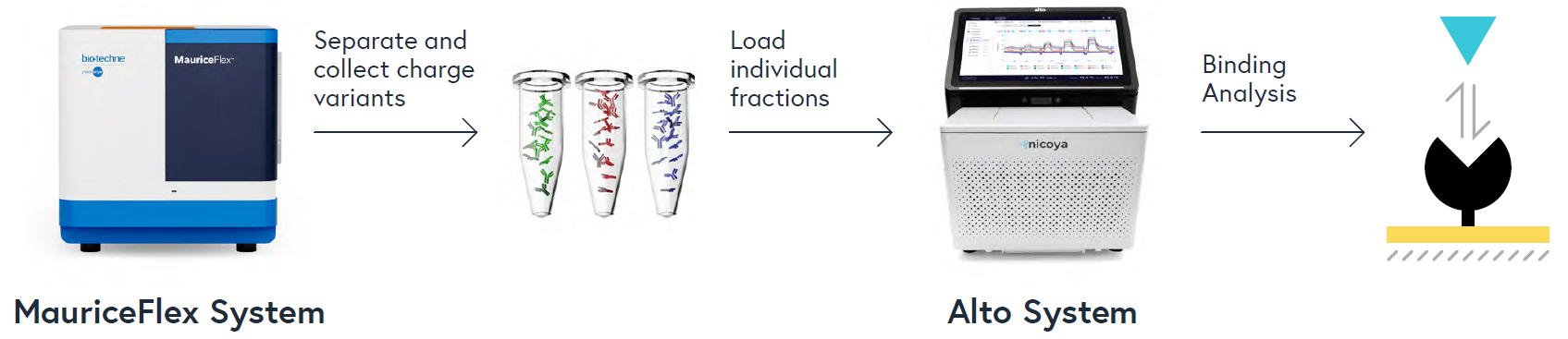 This application note presents a novel and efficient method for determining binding kinetics and affinity based on the charge heterogeneity of biological molecules. The study examined a therapeutic bispecific antibody (BsAb) called Mosunetuzumab and a research-grade biosimilar. First, the charge heterogeneity of both molecules was analyzed using imaged capillary isoelectric focusing (icIEF) on the MauriceFlex™ system, followed by the collection of individual charge variant fractions on the same system. Next, the collected fractions were tested for their ability to bind to ligands CD3 and CD20, which are the intended targets of Mosunetuzumab. To accomplish this, surface plasmon resonance (SPR) with the Alto™ System was used to measure the binding of each fraction and ligand, requiring only 2 μL of each, a key advantage over other SPR platforms due to its low sample volume requirements and higher throughput for fractionated samples. The binding data obtained from SPR correlated well with the structural information obtained from LC-MS analysis of the charge variant fractions, revealing a significantly weaker binding of the acidic fraction of the biosimilar to CD20. Overall, the workflow demonstrated in this study offers a straightforward and broadly applicable approach for correlating the charge heterogeneity of a biomolecule to its binding properties. This approach will help identify critical charge species that impact binding potency to inform the control steps needed in the process development and manufacturing of a biotherapeutic.
