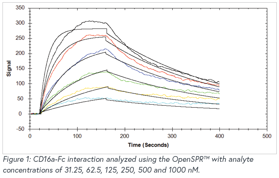 The OpenSPR™ is a powerful instrument providing researchers with in-depth label-free binding kinetics for a variety of different molecular interactions. A side by side comparison study was performed with OpenSPR™, a standard SPR instrument, and a commonly-used BLI instrument to demonstrate that OpenSPR™ can provide the same high-quality data as commonly-used instruments on the market. The standard SPR and BLI instruments are used for analyzing binding kinetics, but cost hundreds of thousands of dollars, making them inaccessible to many researchers who need this data. An Fc-FcR interaction was analyzed using the three instruments under similar conditions to show that the OpenSPR™ can generate comparable results to both the standard SPR and commonly-used BLI systems for a fraction of the cost