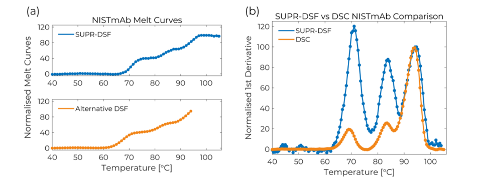 The NISTmAb is a widely characterised monoclonal antibody intended to be used as a reference molecule in the development of novel technology for therapeutic protein characterisation. In this application note, we use the SUPR-DSF to acquire differential scanning fluorimetry (DSF) data on the NISTmAb and compare the results against differential scanning calorimetry (DSC).