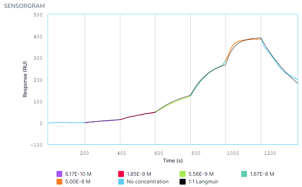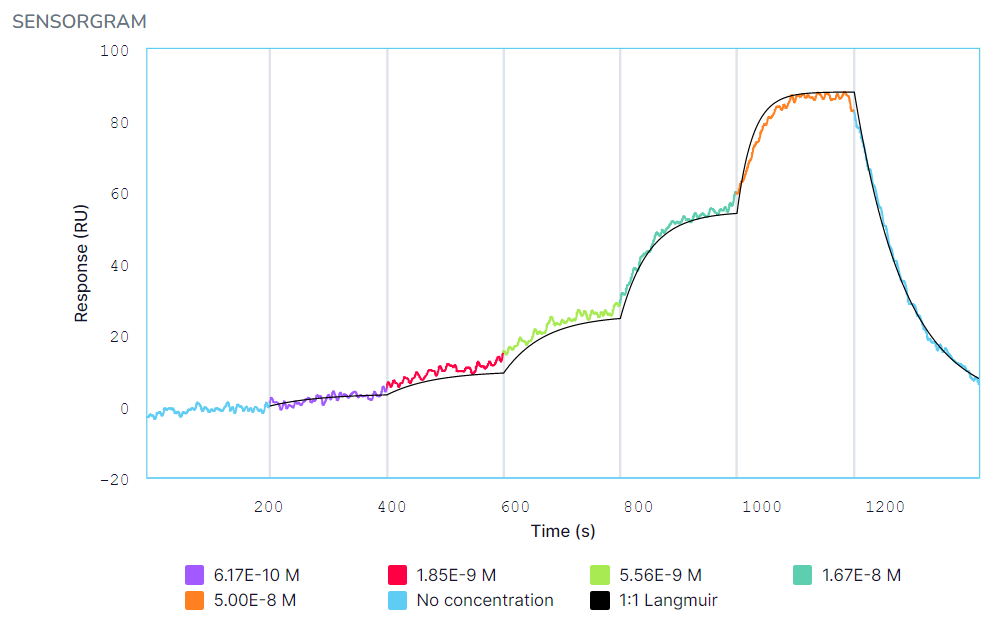 Kinetic fits for HuCAL binding to eGFP in (A) PBS-T and (B) 100% serum + 0.1% Tween 20. The HuCAL analyte was titrated from 0.617 nM to 50 nM, followed by a dissociation in PBS-T or serum. Black curves represent the Langmuir 1:1 binding fit model generated by the Nicosystem software.