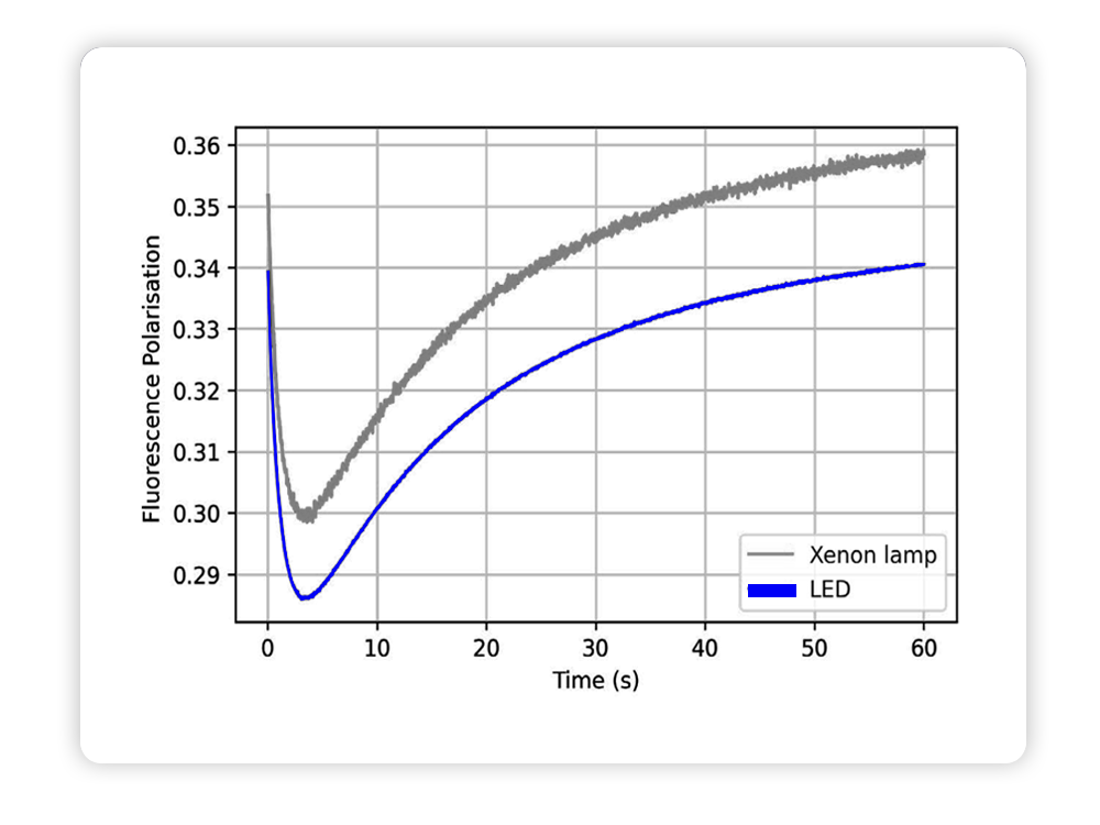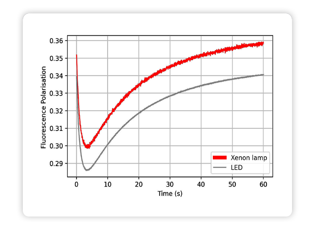 SX20’s interchangeable light sources give researchers the freedom to optimize each experiment. As shown below, the xenon lamp provides substantially higher intensity and signal-to-noise performance for fluorescence polarization kinetics, revealing subtle structural changes with greater precision. LED illumination remains a robust, cost-effective option for routine assays or strongly fluorescent samples. With SX20, you can tailor the setup to the demands of your biology without compromising data quality.