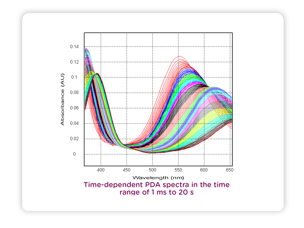 High-speed spectral acquisition reveals reaction intermediates in real time. SX20 captures the full evolution of complex mechanisms across the UV–Vis range, enabling global analysis and multi-step kinetic modeling.